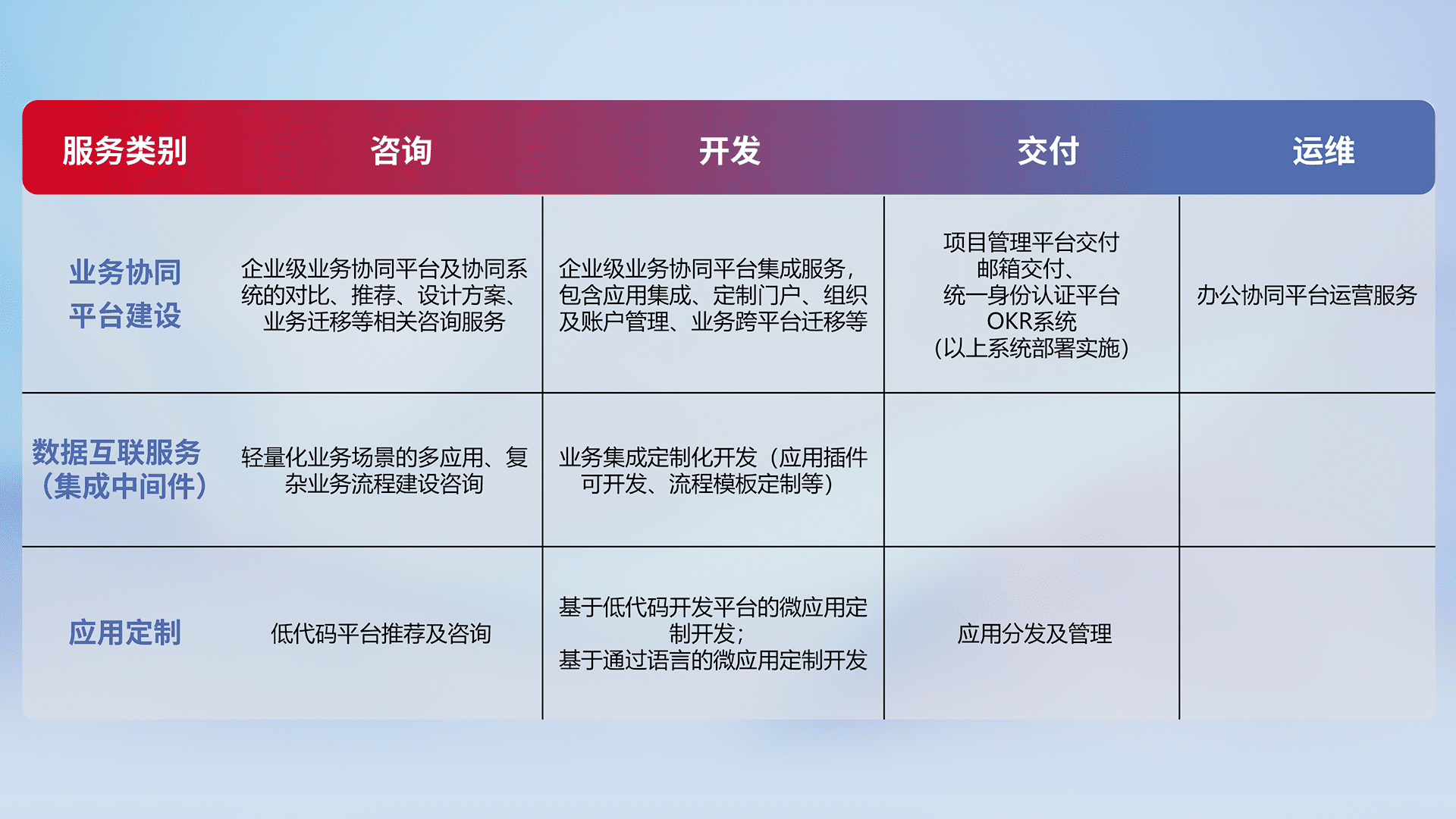 针对钉钉、、企微、、IDaas等平台级产品提供产品的规划、、方案、、、、交付、、、、定制化开发等服务,,,实现如统一协同办公、、智能客户服务、、、、混合会议管理、、、、智能数据查询、、等业务场景,,,,实现数字化转型。。。