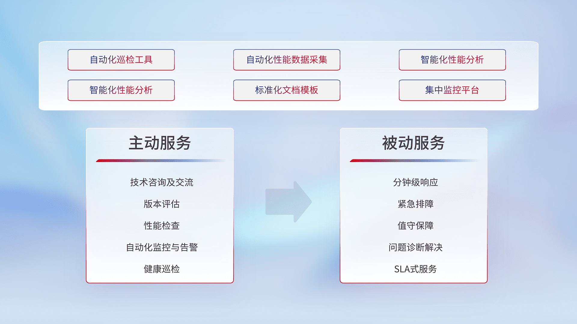 智能化工具和标准化文档,,,保障服务质量,,,提供主动服务(包含技术咨询、、版本评估、、、性能检查、、自动化监控与告警、、、健康巡检)和被动服务包含(分钟级响应、、紧急排障、、值守保障、、问题诊断解决、、、、SLA服务)。。。。
